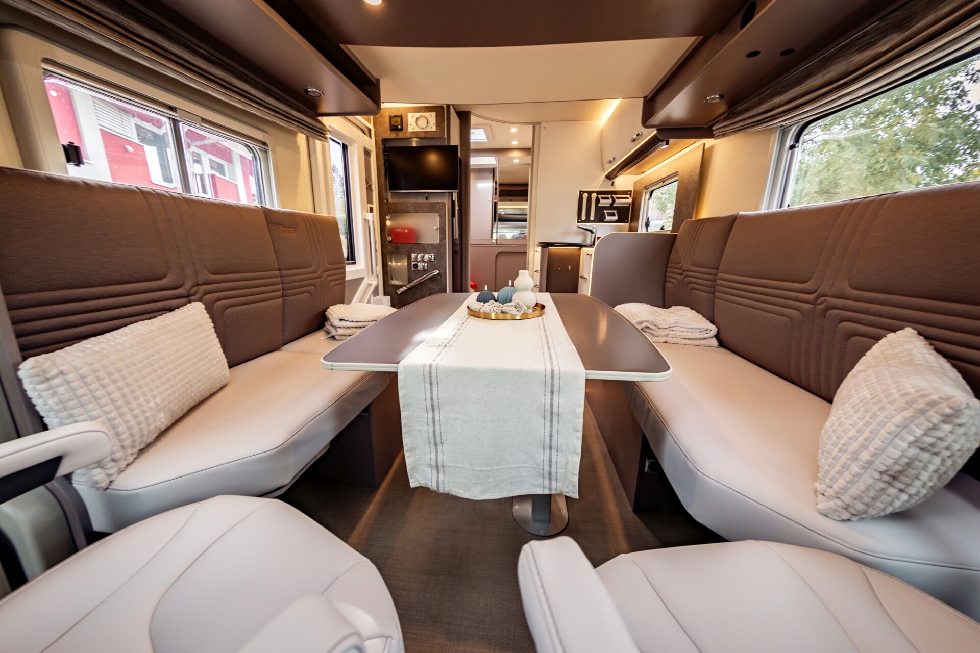 - Im „Wohnraum“ ist Platz, sodass sich hier zwei Menschen gut drehen und bewegen können. Auch die Nutzung eines Rollators ist hier möglich. Die Vordersitze sind drehbar und erweitern somit den Ess- und Sitzbereich. Zudem gibt es zwei gepolsterte Sitzbänke, diese können auch zum Ausruhen und sogar zum Liegen genutzt werden. Der Tisch ist höhenverstellbar und bietet hierdurch die Möglichkeit, diesen individuell auf die Bedarfe der Nutzer einzustellen.